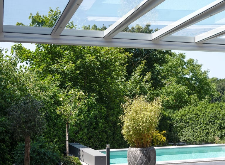 The Pinela features a remote-controlled tilting louvred roof, allowing you to choose between full sun, cooling shade, or total rain protection at the touch of a button.